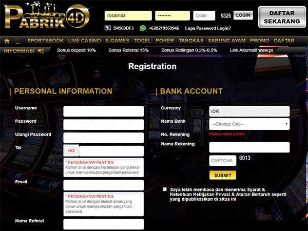 Daftar Judi Online Langsung di Situs Agen Terpercaya Pabrik4D sangatlah mudah dan gampang. Syarat utamanya, Anda hanya perlu memiliki salah satu rekening bank BCA, Mandiri, BNI, BRI atau Danamon. Selain itu, Anda juga harus memiliki Alamat Email & No.HP yang masih dalam keadaan aktif. Sangat nudah bukan?